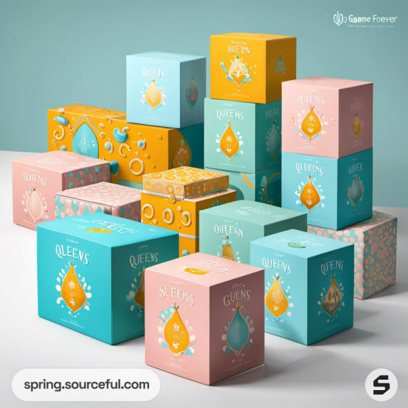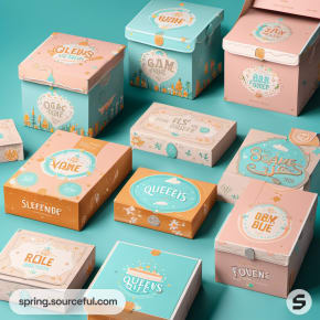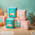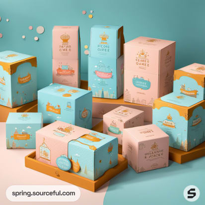 Square boxes with playful pastel designs and patterns on a neutral background.