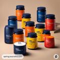 Mixed set of sports supplement jars in blue, orange, and yellow.