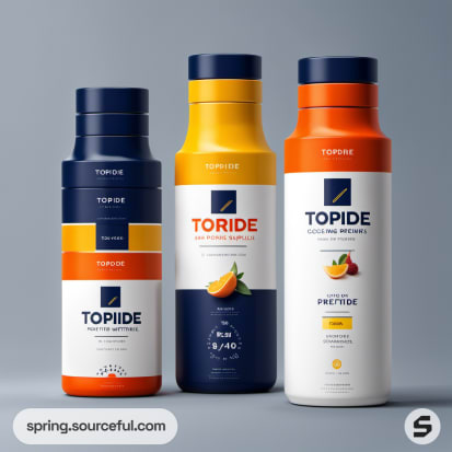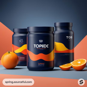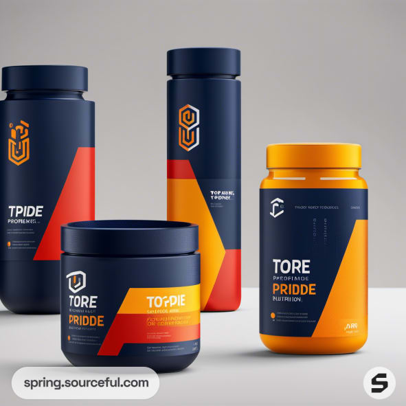 Various orange and blue sports supplement containers with sleek designs.