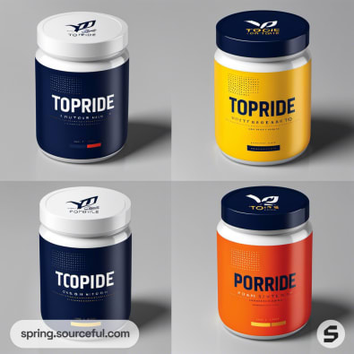 Four round jars of sports supplements in navy, yellow, and white.