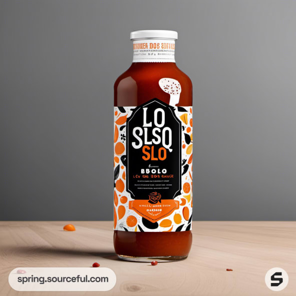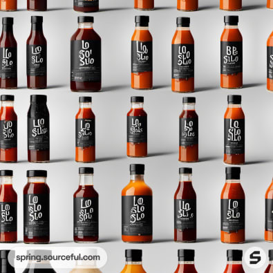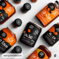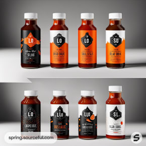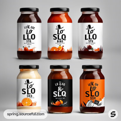 Assorted jars and bottles with orange and black labels arranged aesthetically.