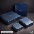 Navy blue nested boxes of different sizes with a sophisticated design on a dark background.