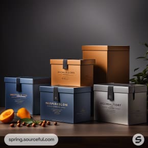 Four luxury square boxes in blue, copper, and gray, featuring a premium look with fruit accents.