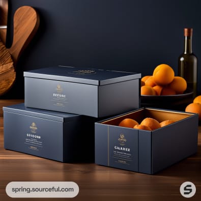 Open boxes in navy and orange, neatly arranged with fruits, creating a premium look.