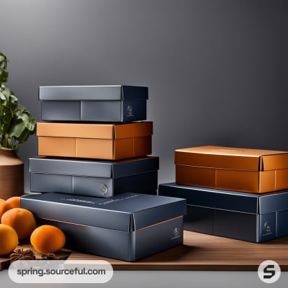Various orange and blue boxes with metallic accents, showcasing a modern and sleek design.