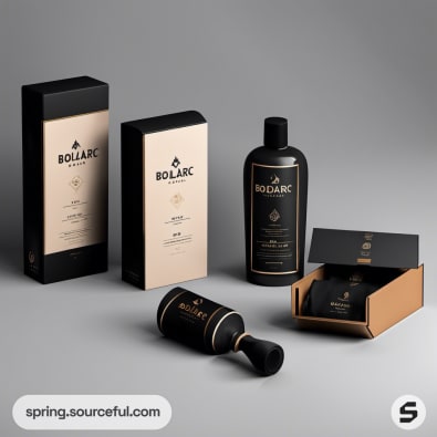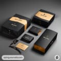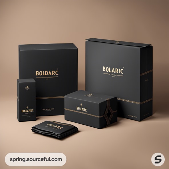 Black and gold luxury packaging with various box sizes on a beige background.