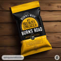 Yellow and black snack bag with bold vintage lettering on wooden background.