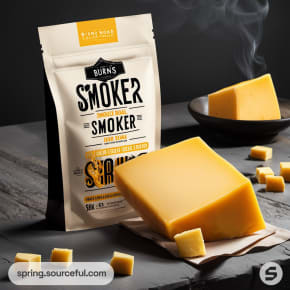 Yellow resealable pouch with black stripes and silhouette of a cheese wheel.
