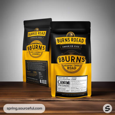 Black and yellow stand-up pouches with bold text and circular graphics on wooden surface.