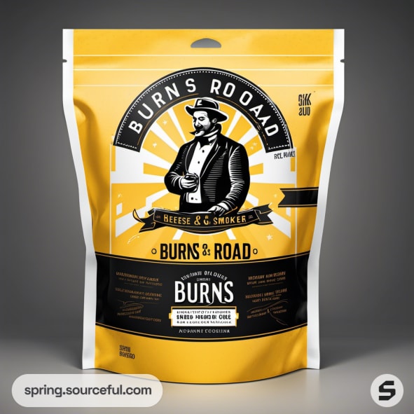 Yellow and black resealable pouch with retro design, featuring a man and sunburst graphic.