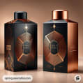 Elegant packaging with geometric patterns in black, orange, and green colors.