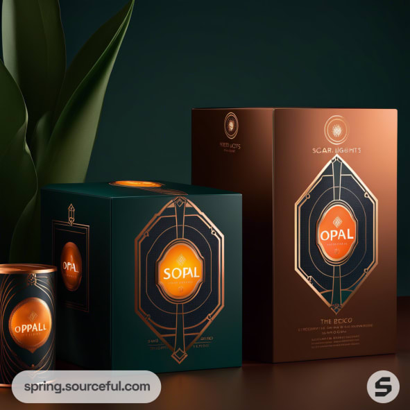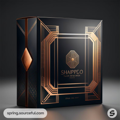 Art deco style black and copper packaging with geometric design on boxes.