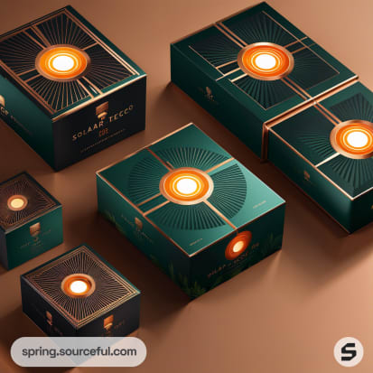 Elegant black cube boxes with gold and orange accents; circular patterns and central logo design.