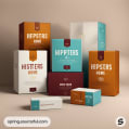 Assorted hipster-themed boxes in teal and maroon with geometric designs.