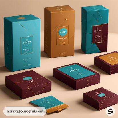 Various teal and maroon packages with modern graphic designs.