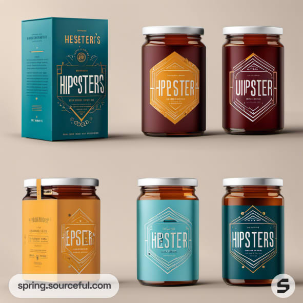 Glass jars with hipster-themed labels and a teal box packaging.