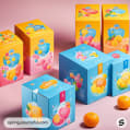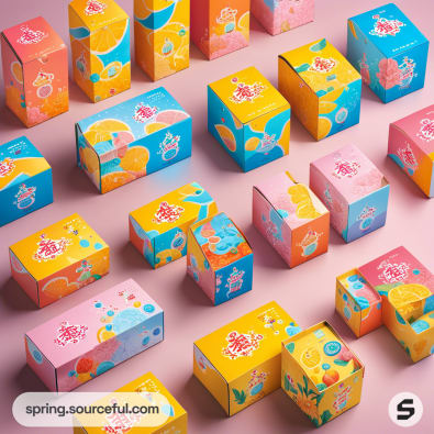 Colorful fruit-themed boxes with vibrant designs against a pink background.