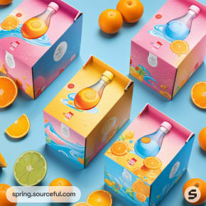 Colorful mailer boxes with citrus fruit designs and images of bottled drinks on a blue background with oranges.