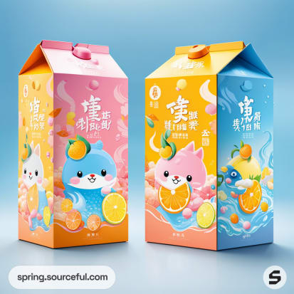 Cartons with cute cartoon characters, one pink with oranges, one blue with peaches, colorful splashes on each.