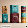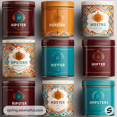 Hipster-themed boxes and tubs in teal, maroon, and mustard colors.