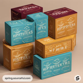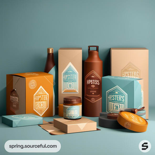 Cylindrical and rectangular hipster packages in teal and brown hues.