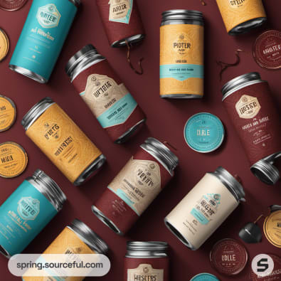 Assorted hipster drink cans in teal and brown labels on a burgundy background.