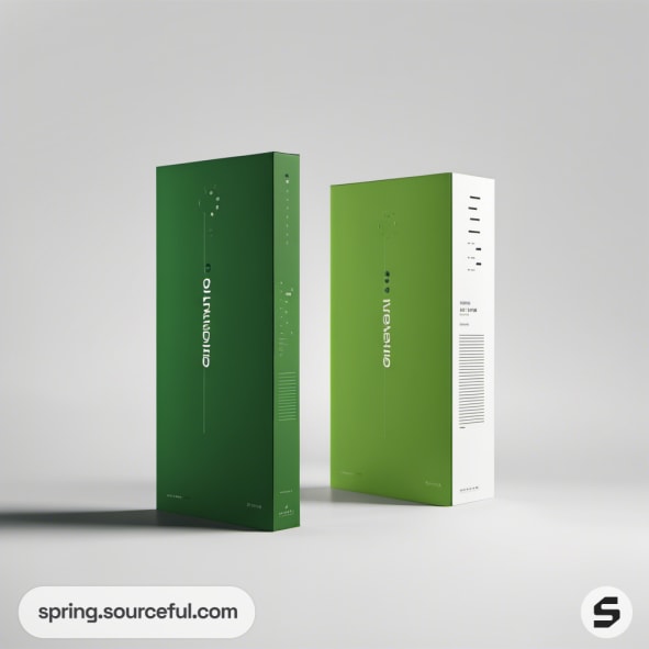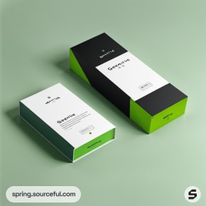 Two boxes with green and black sleek designs on a light green surface.