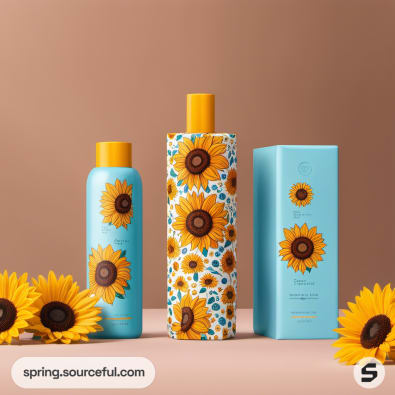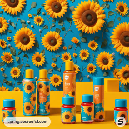 Assorted bottles and jars with sunflower motifs on a light blue surface.