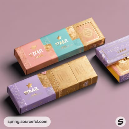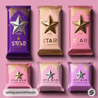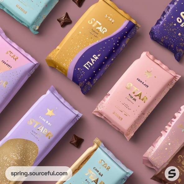Discover the perfect blend of cute, bohemian, pastel, and edgy aesthetics in our chocolate bar packaging inspiration. Our designs, featuring a vibrant color scheme of violet, pink, silver, and gold, will make your product stand out. Whether it's a simple wrapper or an intricate box, we cater to all packaging types. Elevate your chocolate bar's appeal with our unique and captivating packaging designs.