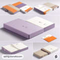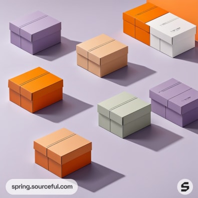 Colorful rectangular boxes with minimalist design in orange, purple, beige, and green on a neutral background.