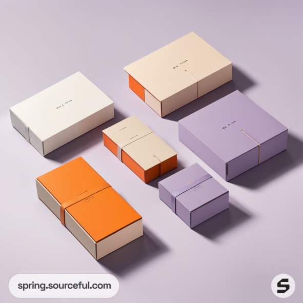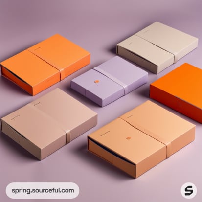 Various rectangular gift boxes in orange, beige, and lavender on a purple surface.