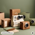 Retro cameras with packaging in neutral tones and box styles.