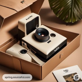 Open camera box showcasing vintage camera in earthy tones.