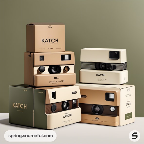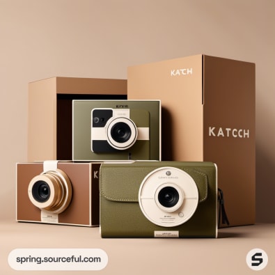 Multiple cameras with sleek packaging in beige and olive.