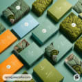 A collection of moss-patterned packaging in soft greens and blues with textured designs.