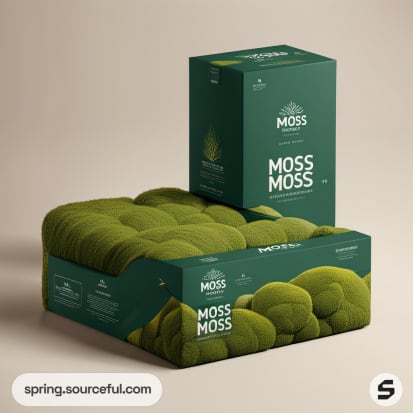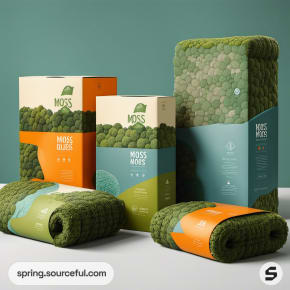 Assorted moss-themed packaging in various sizes and styles, featuring light green and orange colors.