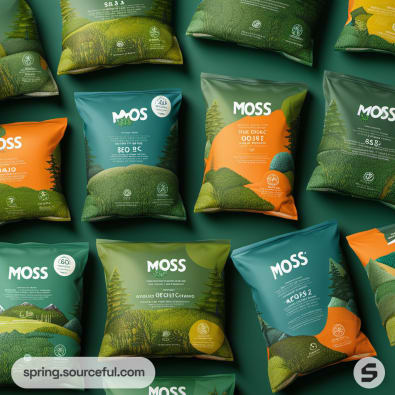 Green and orange packaging with moss patterns, featuring resealable pouches and boxes.