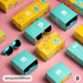Colorful mailer boxes with sunglasses design in pink, blue, and yellow tones.