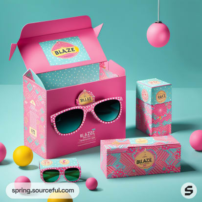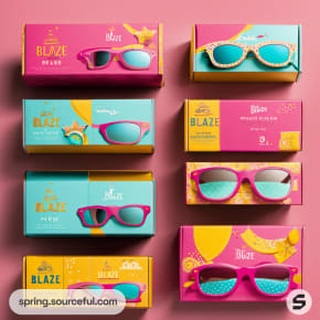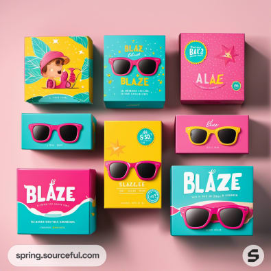 Collection of vibrant packaging with sunglasses design on a pink backdrop.