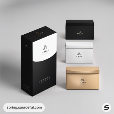 Black, white, and gold product boxes with simple logo design and text, arranged together.