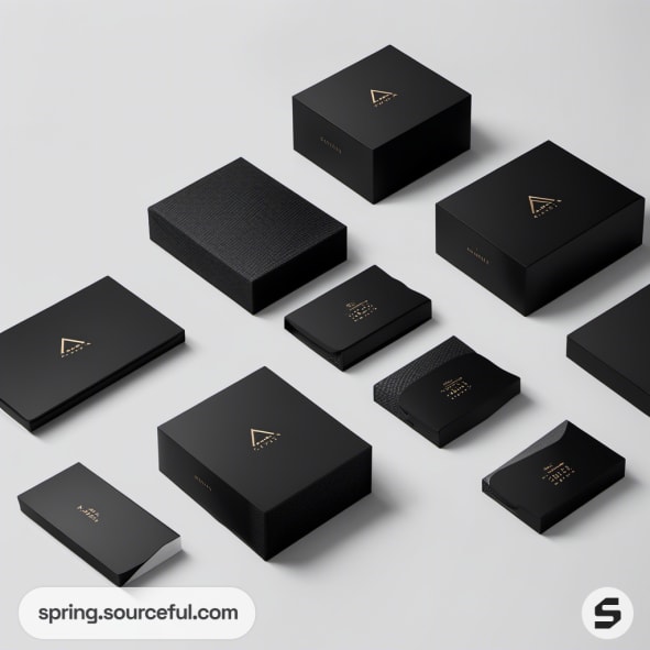 Black themed packaging boxes with gold logos, various sizes and shapes on a light background.