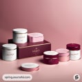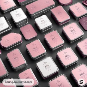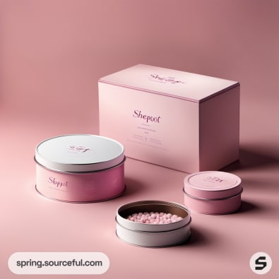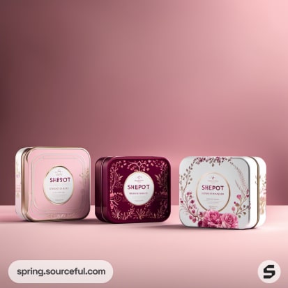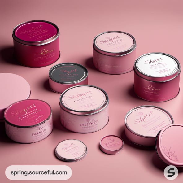 Various Shepot branded tins in pink and burgundy on a pink backdrop.