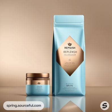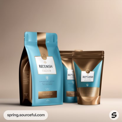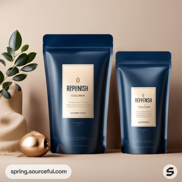 Dark blue resealable pouch with ornate gold details and ingredients.