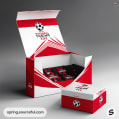 Red and white open sports packaging box with soccer ball design on a gray surface.
