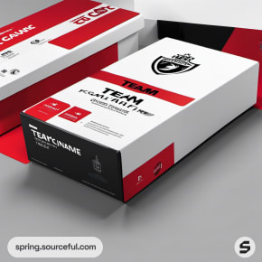 Black and red rectangular box with white lid, featuring team name on gray surface.