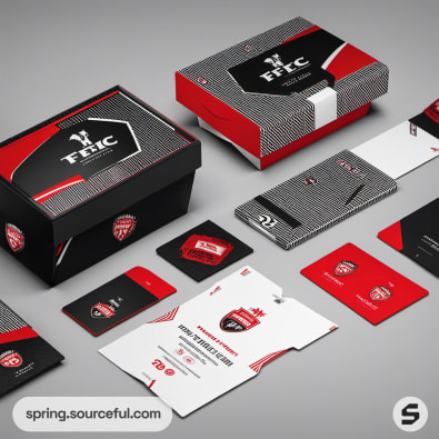 Red and black sports packaging including boxes and cards with team branding on a gray surface.
