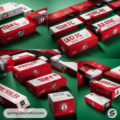 Red and white geometric patterned sports packaging boxes with team logos on a gray background.