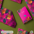 Vibrant mailer boxes in green and pink with tropical leaf patterns set on a colorful background.