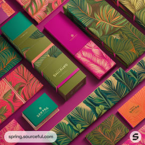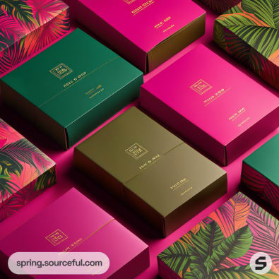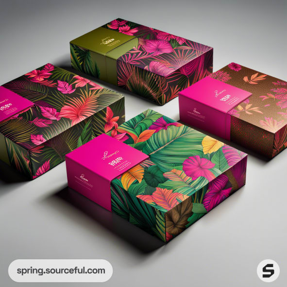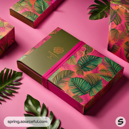 Colorful tropical-themed packaging in various sizes, featuring vibrant leaf patterns on pink, green, and brown boxes.