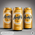 Three Andy's beer cans with gold labels featuring vintage designs.